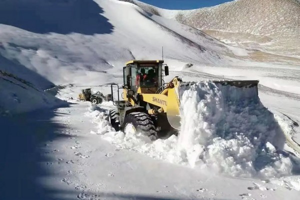 公路籌備組保通人員巡查發現險情后,立即啟動除雪保通應急預案,積極投入到除雪保通工作中。為確保在最短的時間內恢復道路通行,12名保通人員、5臺裝載機夜以繼日,冒雪夜戰,清理積雪30多萬立方米。此次參與公路除雪任務的山推5噸裝載機,動力強勁,轉向靈活,掘起力大,提升力強,滿斗率高,特別適合松散物料的裝載鏟運作業。歷時30多小時,積雪路段恢復通行。為進一步提高道路通行能力,保通人員繼續對該路段進行路面拓寬施工,繼續奮戰6個多小時,保通工作全面完成。