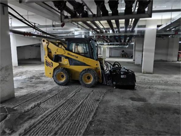 該小區(qū)地處市區(qū)核心板塊,周邊配套完善,地庫(kù)總面積約3萬(wàn)平方米,整體為水泥硬化地面。為滿(mǎn)足后續(xù)自流平地坪施工的需求,地面必須經(jīng)過(guò)銑刨處理,確保材料與基礎(chǔ)面充分貼合。此前,客戶(hù)主要采用人工手推式銑刨鼓進(jìn)行處理,效率低、粉塵大、勞動(dòng)強(qiáng)度高,難以滿(mǎn)足項(xiàng)目對(duì)施工進(jìn)度和質(zhì)量的一致性要求。