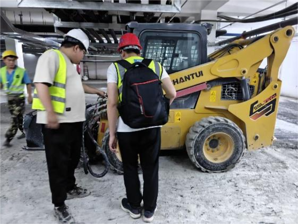 項(xiàng)目啟動(dòng)后,山推技術(shù)團(tuán)隊(duì)為客戶(hù)量身推薦了SSL75V-M滑移裝載機(jī),配置快換銑刨鼓及清掃器等屬具。面對(duì)地庫(kù)內(nèi)2.1米的高度限制,SSL75V-M整機(jī)高度僅2065mm,轉(zhuǎn)向靈活,在狹小空間內(nèi)表現(xiàn)出色;配套的大流量屬具液壓系統(tǒng),保障了銑刨鼓的動(dòng)力輸出,在硬質(zhì)水泥地面也能高效作業(yè),日均銑刨面積可達(dá)1000㎡,施工效率提升75%以上。